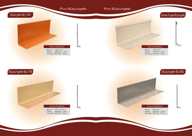 Vinyl PVC yer kaplaması yapılan ofis, hastane , oteller ve taban döşemesi yapılan yerler için ideal çözüm.Süpürgelikler ev dekorasyonunun aslında önemli bir parçasıdır. Ev duvarının diplerinde kalan boya ve ya sıva kalıntılarını gizlemenin en kolay ve dekoratif yolu süpürgeliklerdir. Piyasada birçok farklı süpürgelik türü ve modeli olmakla birlikte son dönemde en çok plastik (PVC)süpürgelikler kullanılmaya başlandı. Esnek ve kepli yastıklı süpürgelikler tasarım kolaylıkları, dekorasyonda uygulama kolaylıkları, geniş renk ve model seçenekleri ve uygun fiyatlarıyla şuanda birçok kişinin tercihi olmuştur.